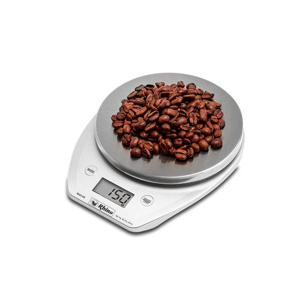 Báscula de cocina RHINO BACI-5X con capacidad de 5 kg y precisión de 1 g. Incluye conectividad Bluetooth para sincronizar con la app Nutridays, función TARA, plato de acero inoxidable y cálculo de volumen. Ideal para un control nutricional preciso.