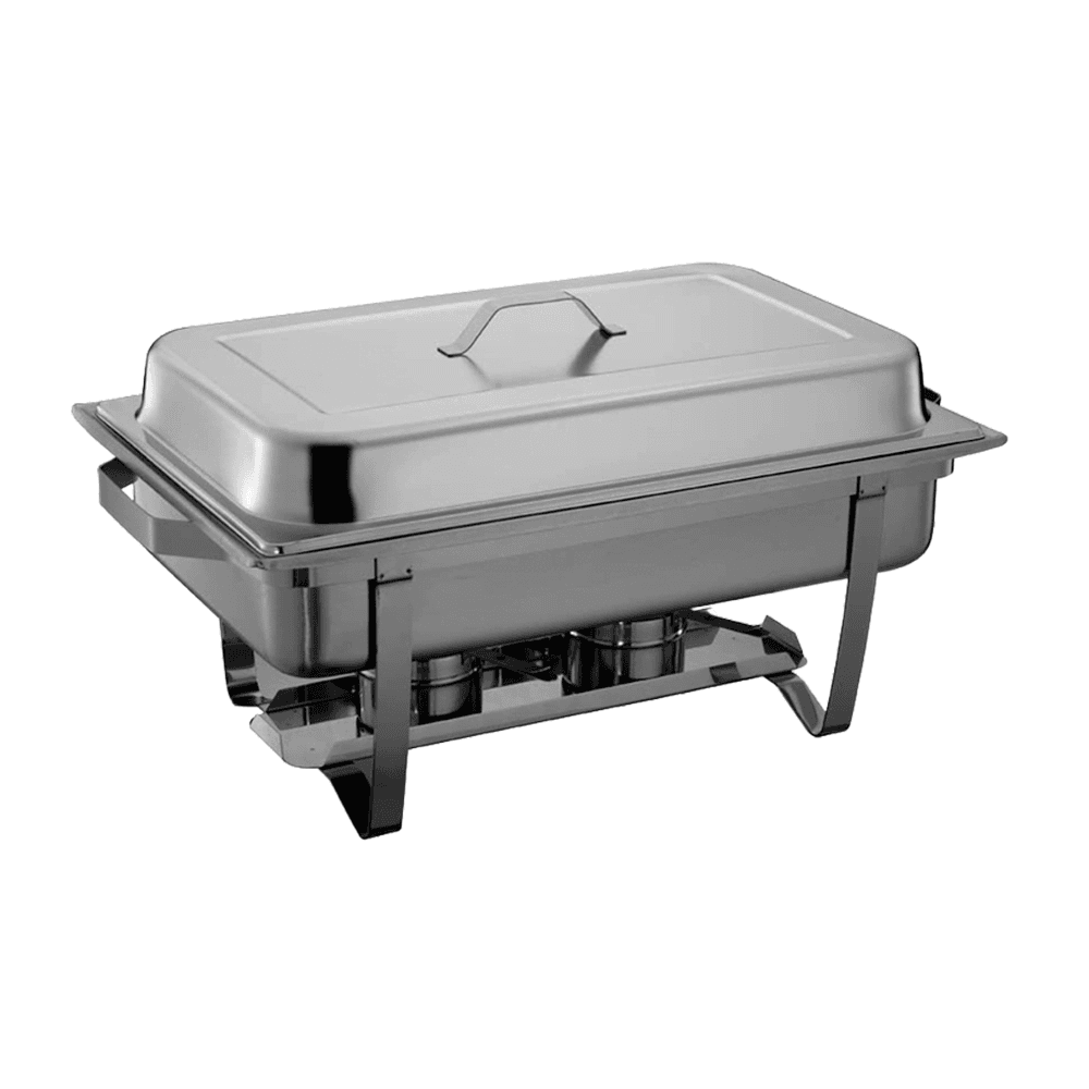 Chafer económico modelo CHECRE-9 de acero inoxidable calibre 25 con capacidad de 9 litros. Diseño entero rectangular con acabado pulido en tapa. Ideal para servicio profesional de alimentos en hoteles, banquetes y buffets. Incluye inserto entero y cuenta con certificación de calidad.